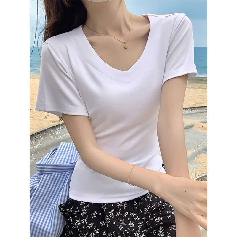 低领露锁骨正肩半袖白色短袖t恤女甜辣妹紧身收腰小个子夏季上衣