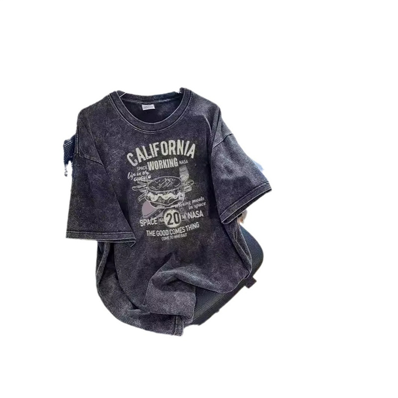 美式vintage小众设计感纯棉做旧短袖t恤女夏季欧货宽松胖妹mm上衣