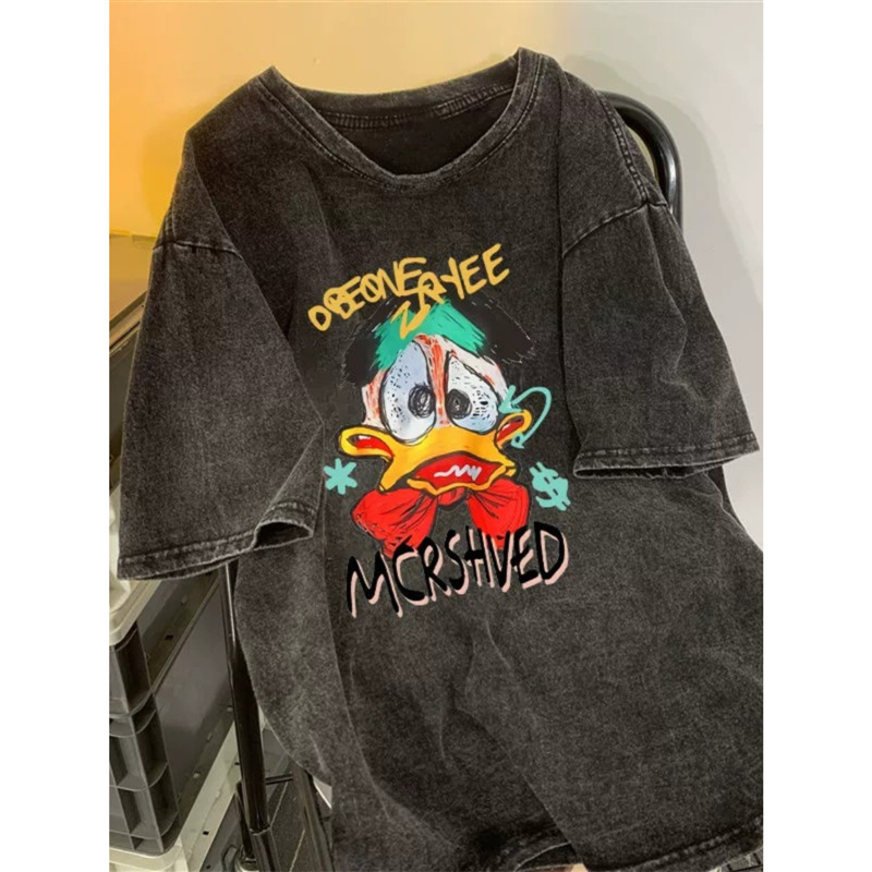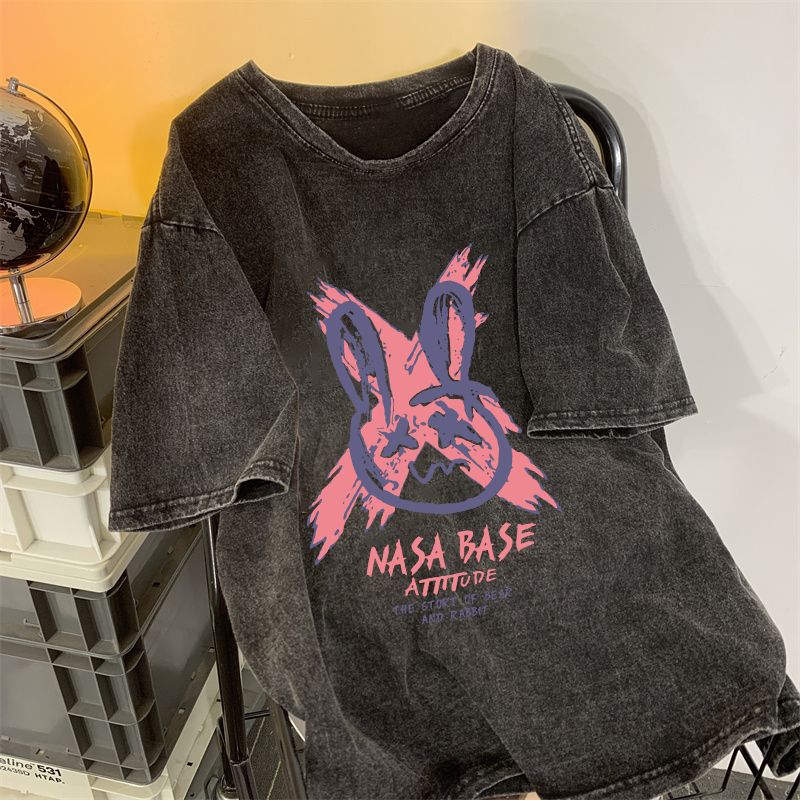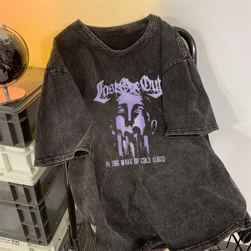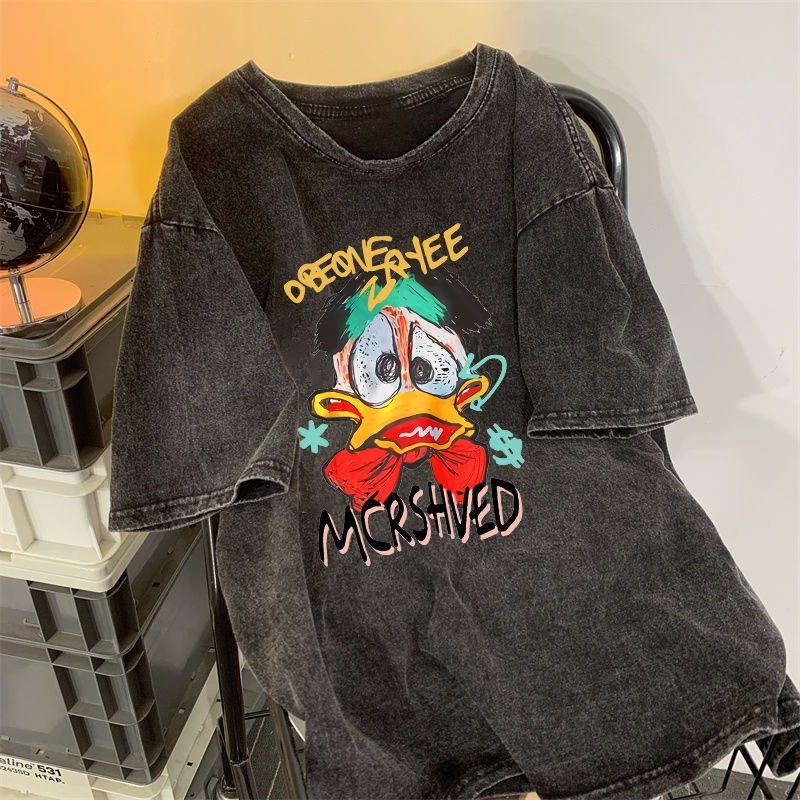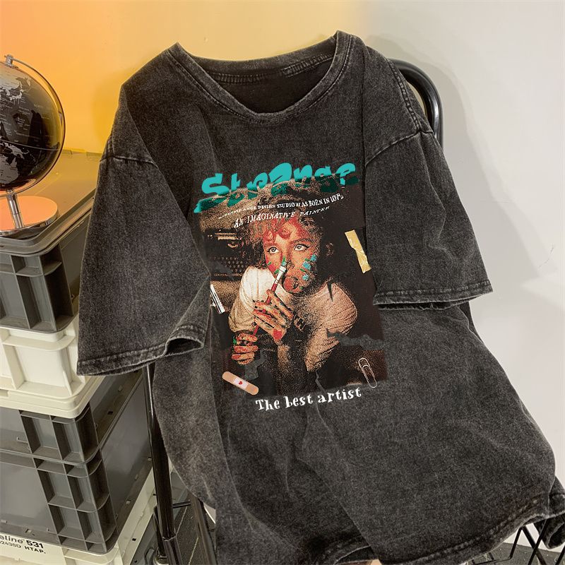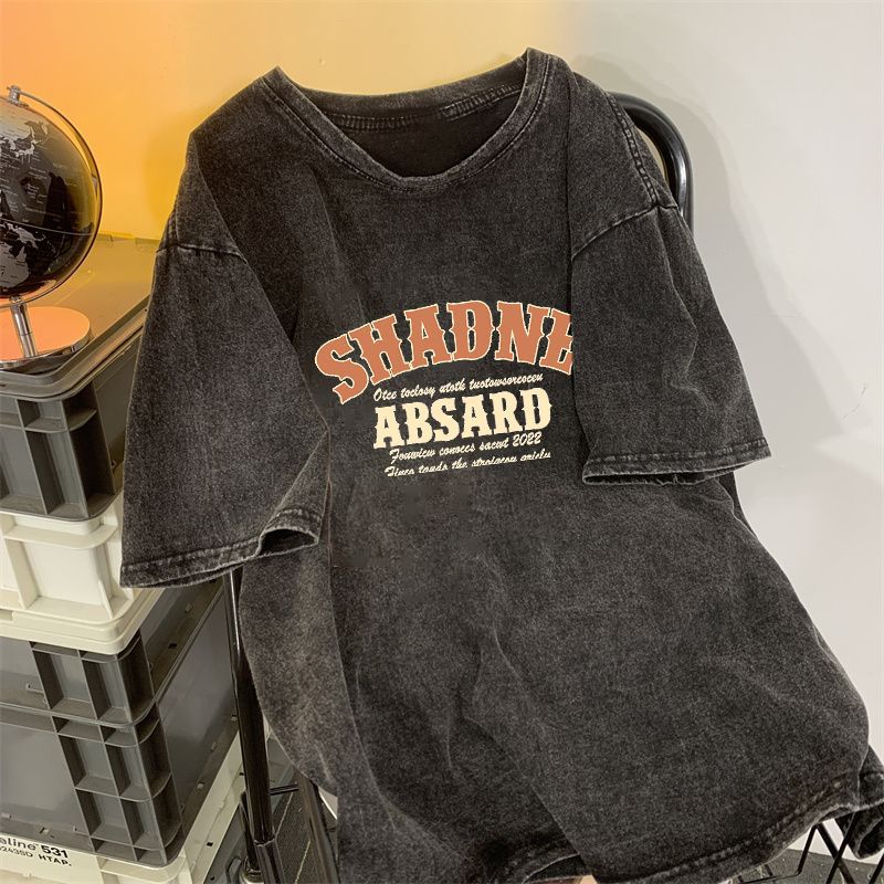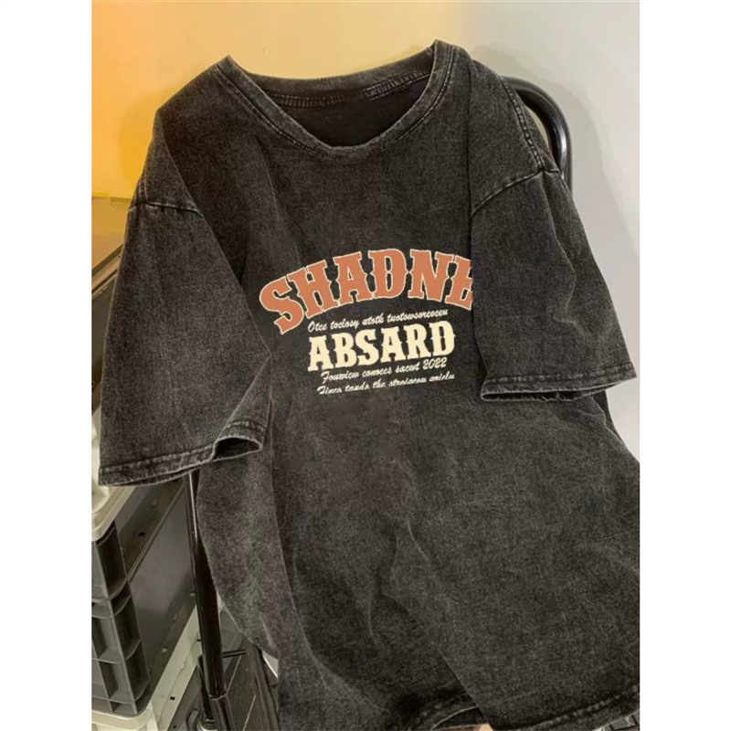 夏ins宽松大码200斤水洗做旧短袖t恤女印花纯棉半袖情侣上衣