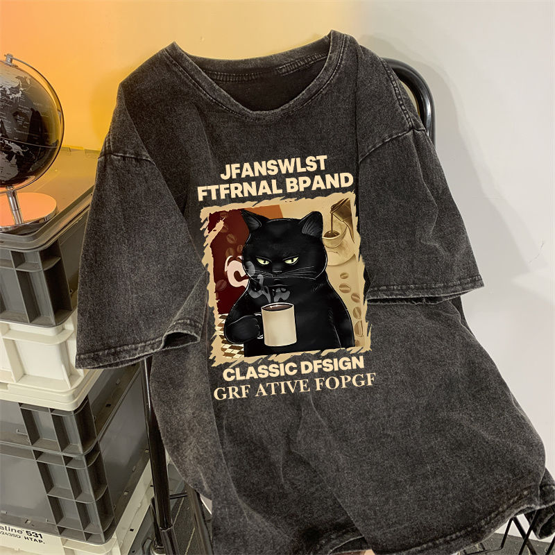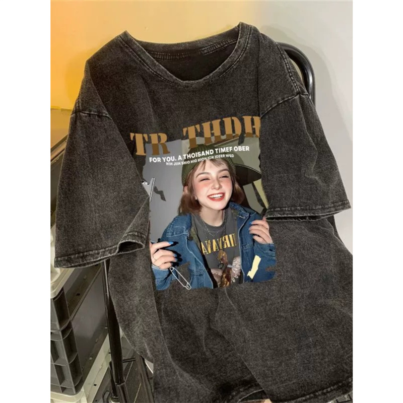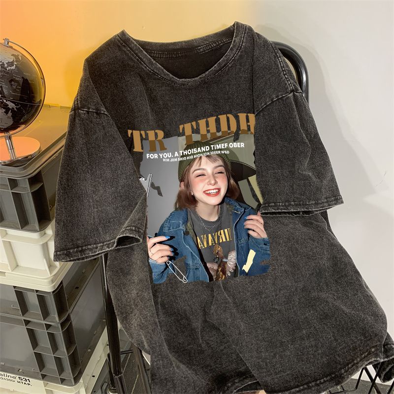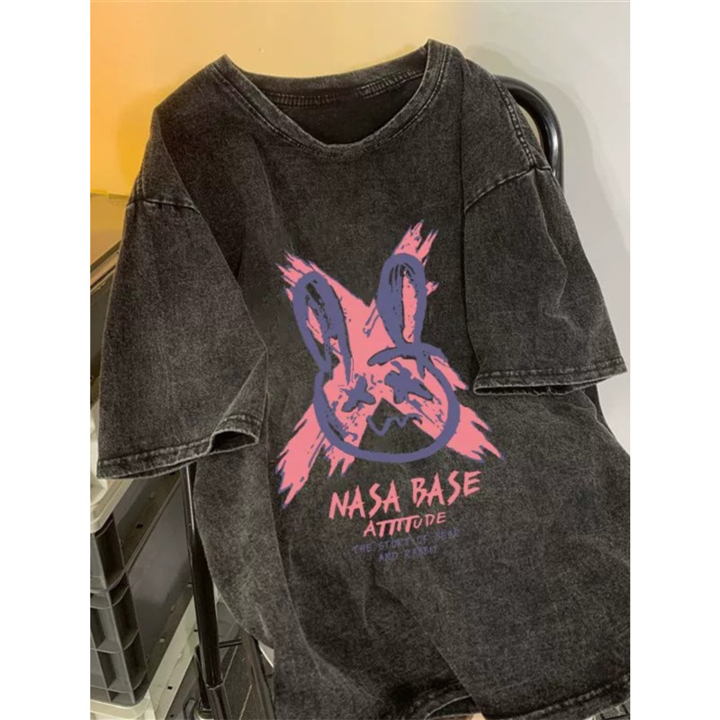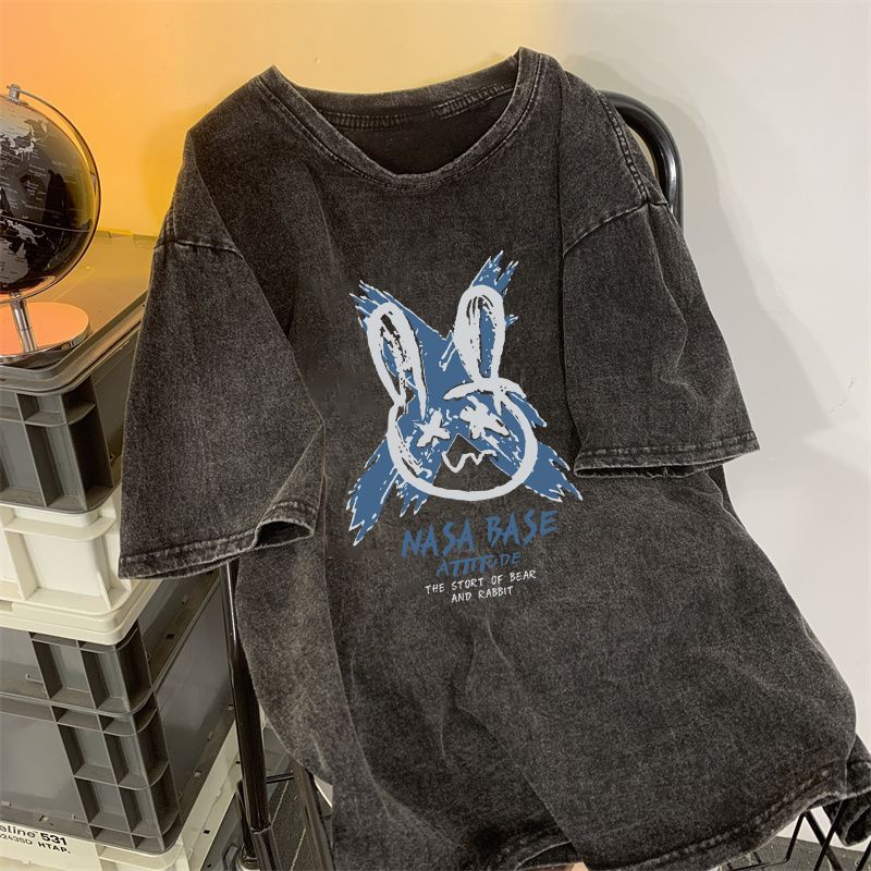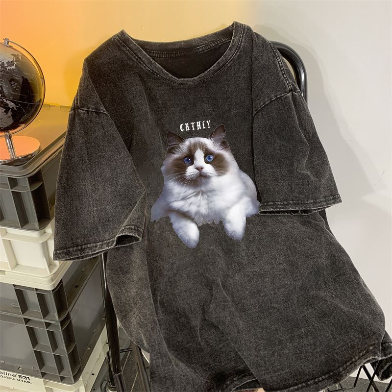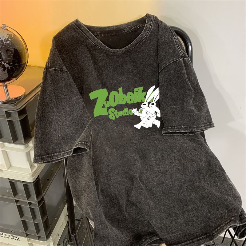 夏ins宽松大码200斤水洗做旧短袖t恤女印花纯棉半袖情侣上衣
