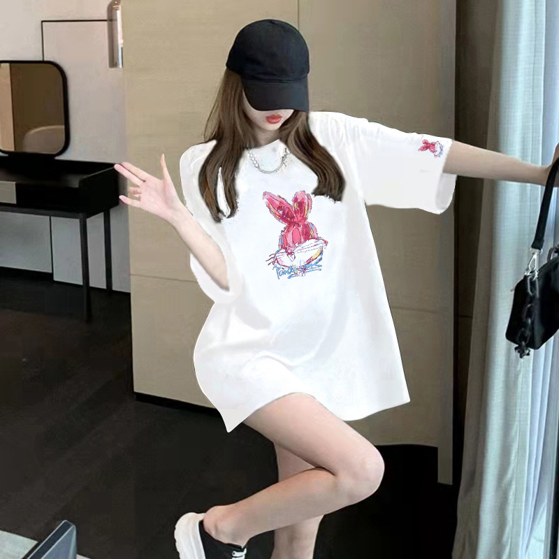 大码下衣失踪白色卡通短袖T恤女中长款2025夏新款宽松纯棉