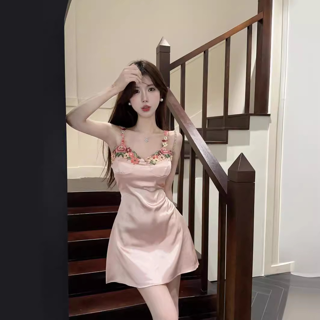 设计感网纱小红书立体花吊带修身粉色度假风小性感纯欲连衣裙显瘦