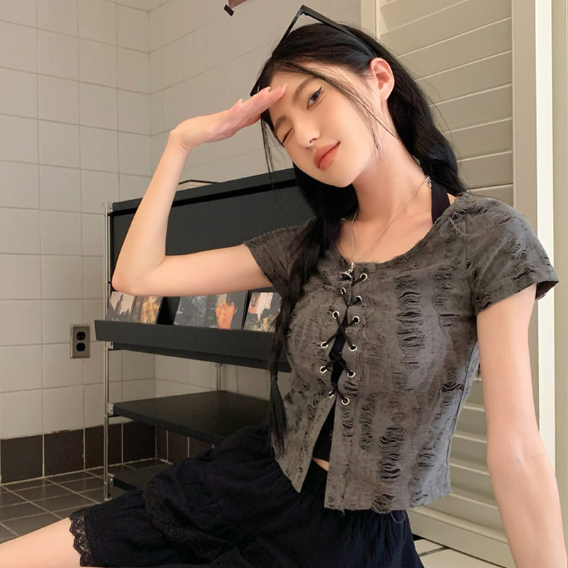 废土风挂脖破洞上衣女夏季绑带修身显瘦方领破洞短袖T恤两件套ins