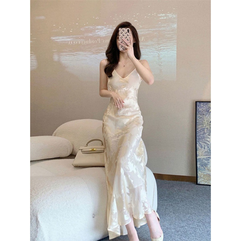 法式白色V领吊带连衣裙女夏季新款温柔风高档感名媛包臀长裙