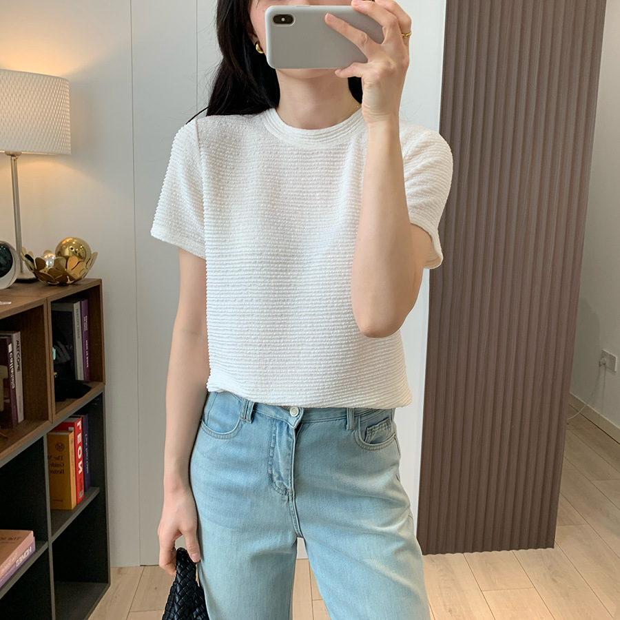 清爽秀气 岛国醋酸 细褶皱极简风小圆领基础百搭直筒短袖T恤春夏