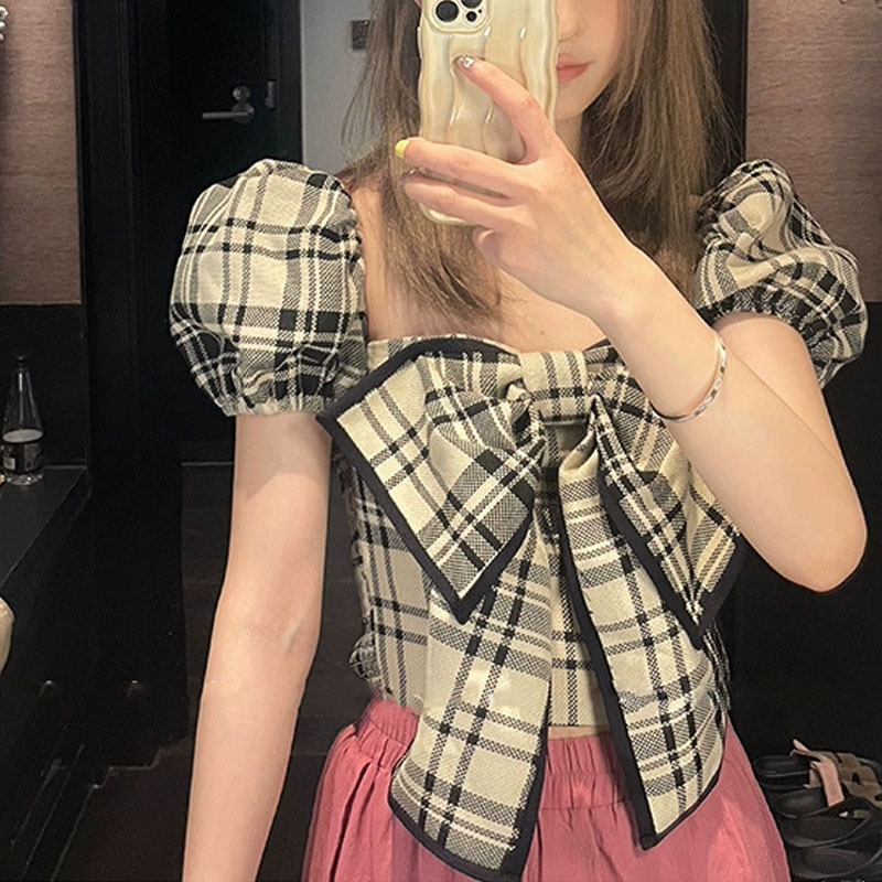 【貌美大小姐既视感】蝴蝶结短上衣夏季设计感修身显瘦泡泡袖小衫