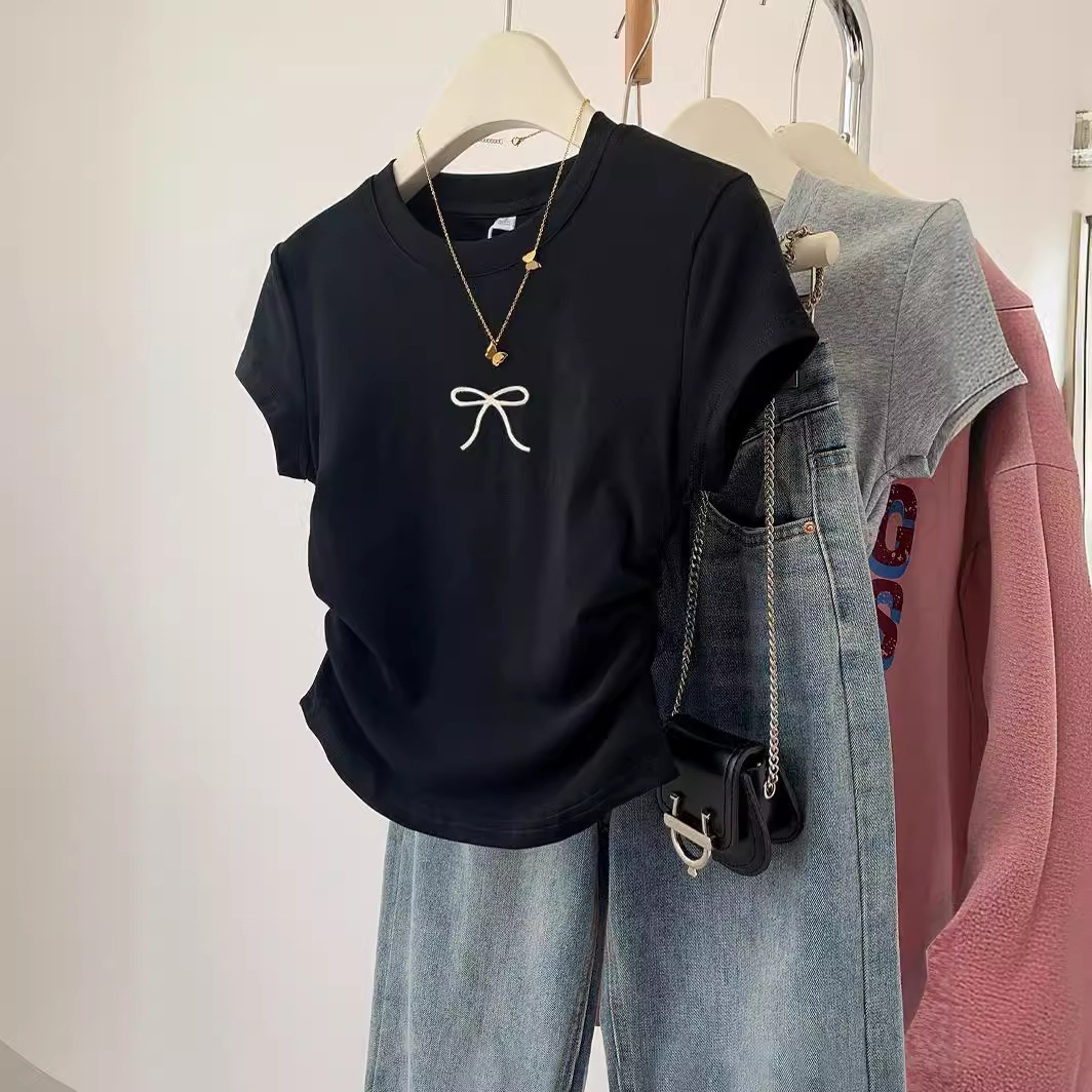 黑色短款蝴蝶结正肩短袖t恤女夏季新款小个子修身体恤上衣夏