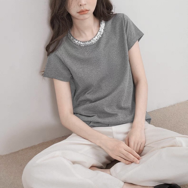 亮片上衣设计感小众灰色宽松百搭短款纯棉正肩短袖女t恤夏