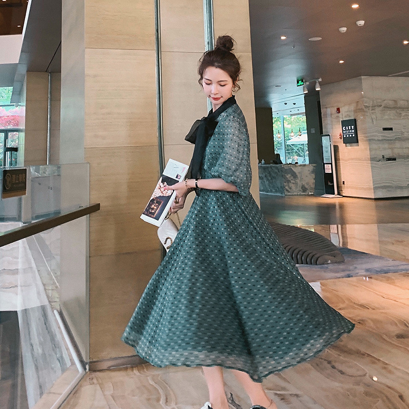 法式清新波点连衣裙女蝴蝶领泡泡袖高腰A字型收腰显瘦桔梗休闲裙