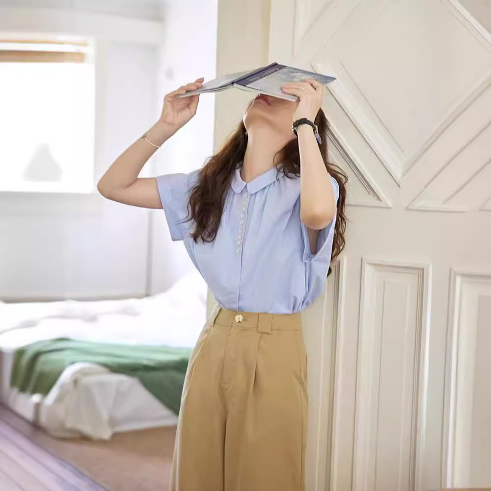 法式复古娃娃领贝壳扣设计感衬衫夏季显瘦短袖女