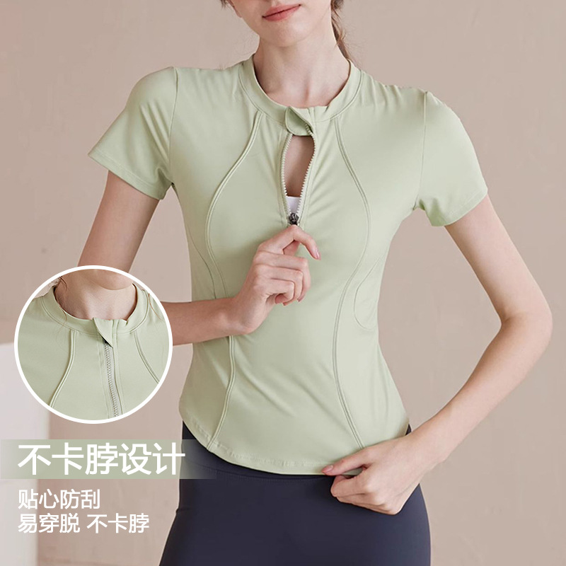 瑜伽服上衣女夏季半拉链紧身收腰运动短袖T恤显瘦速干训练健身衣