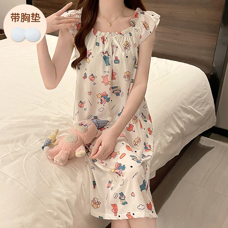夏季带胸垫可拆卸吊带睡裙薄款甜美仙女风梭织泡泡棉可外穿家居服