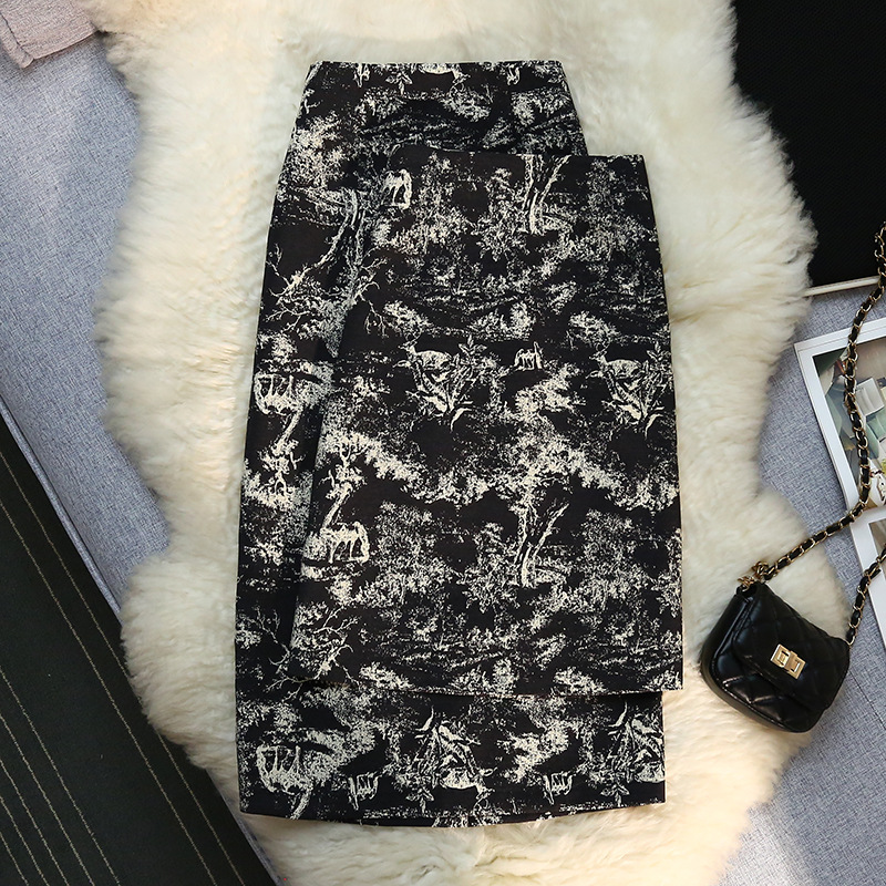 水墨提花半身裙女春夏新款复古高级气质中长款开叉包臀一步裙