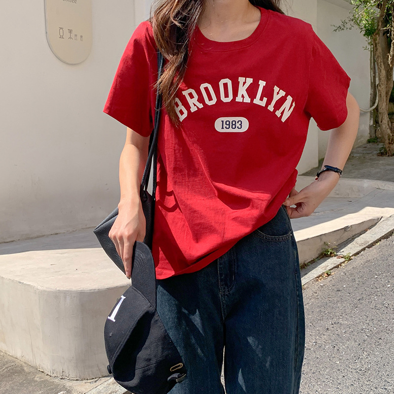 韩版新款纯棉中长款圆领短袖T恤女夏季美式印花正肩欧货上衣