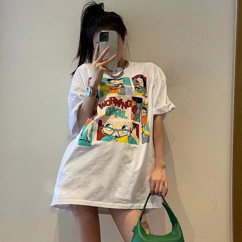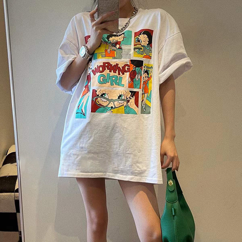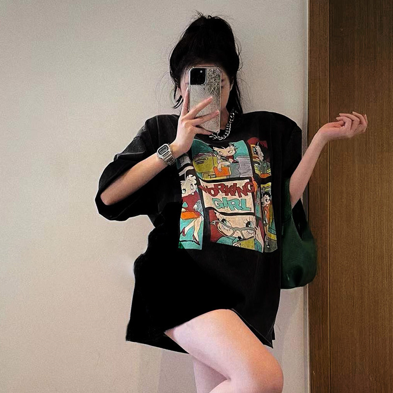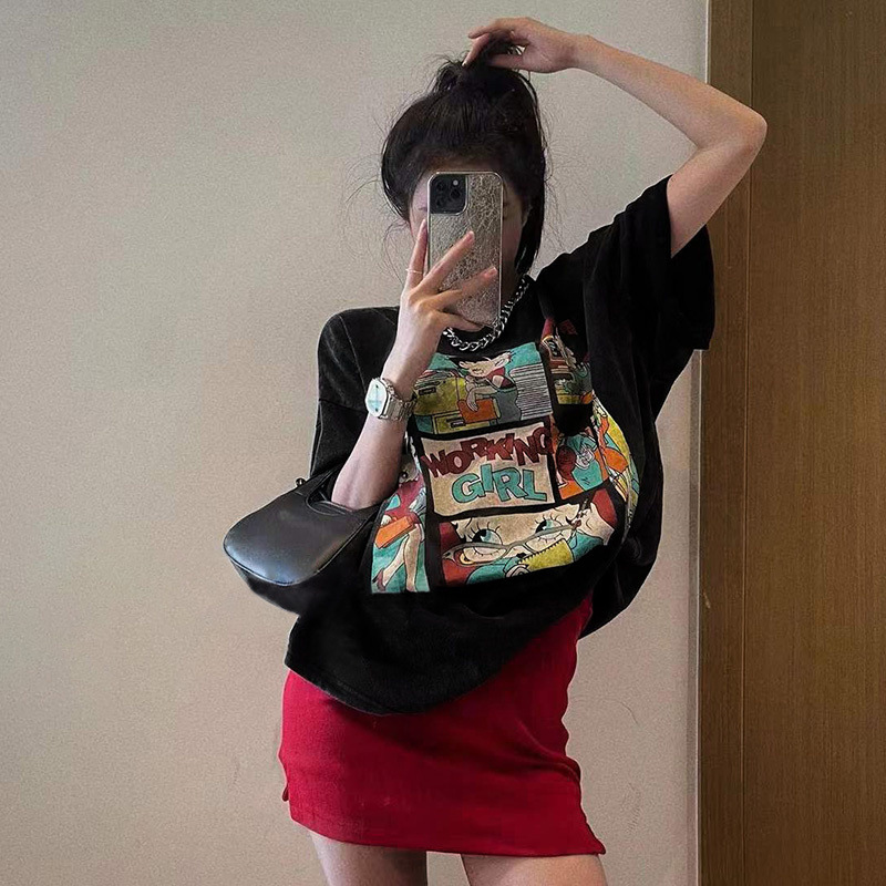 夏季欧美街头风设计感正肩休闲大码t恤女潮牌ins宽松纯棉短袖上衣