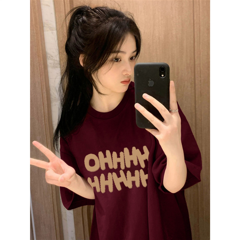 美式复古酒红色T恤女秋冬季加厚磨毛短袖oversize宽松夏纯棉半袖