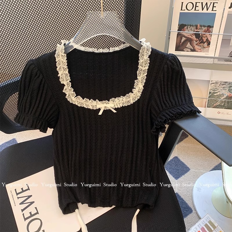 法式锁骨方领蕾丝花边t恤女短袖夏季女装纯欲风泡泡袖短款小上衣