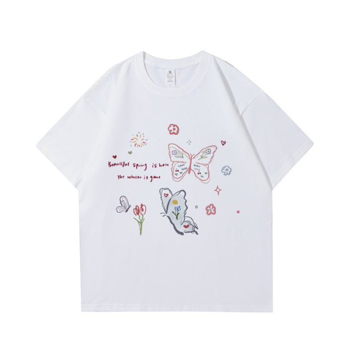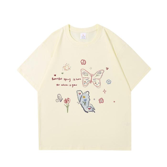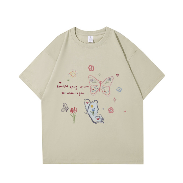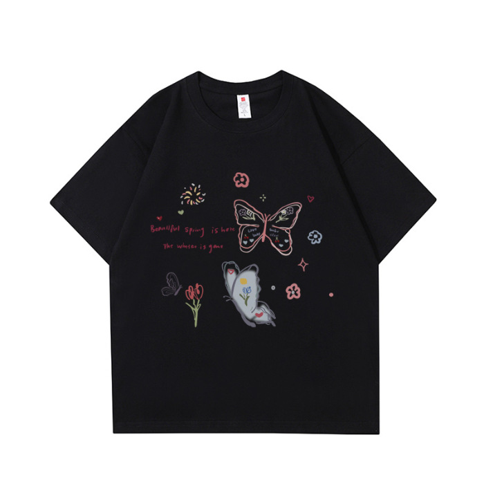 美式复古蝴蝶印花短袖T恤女夏秋设计感小众别致独特短款辣妹上衣