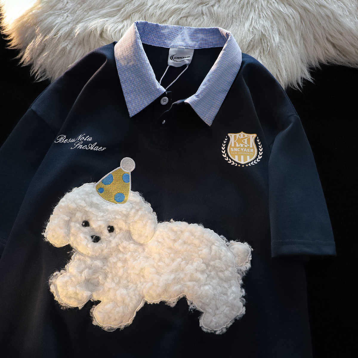 日系可爱小狗刺绣polo领短袖t恤女纯棉夏宽松学院风半袖情侣上衣