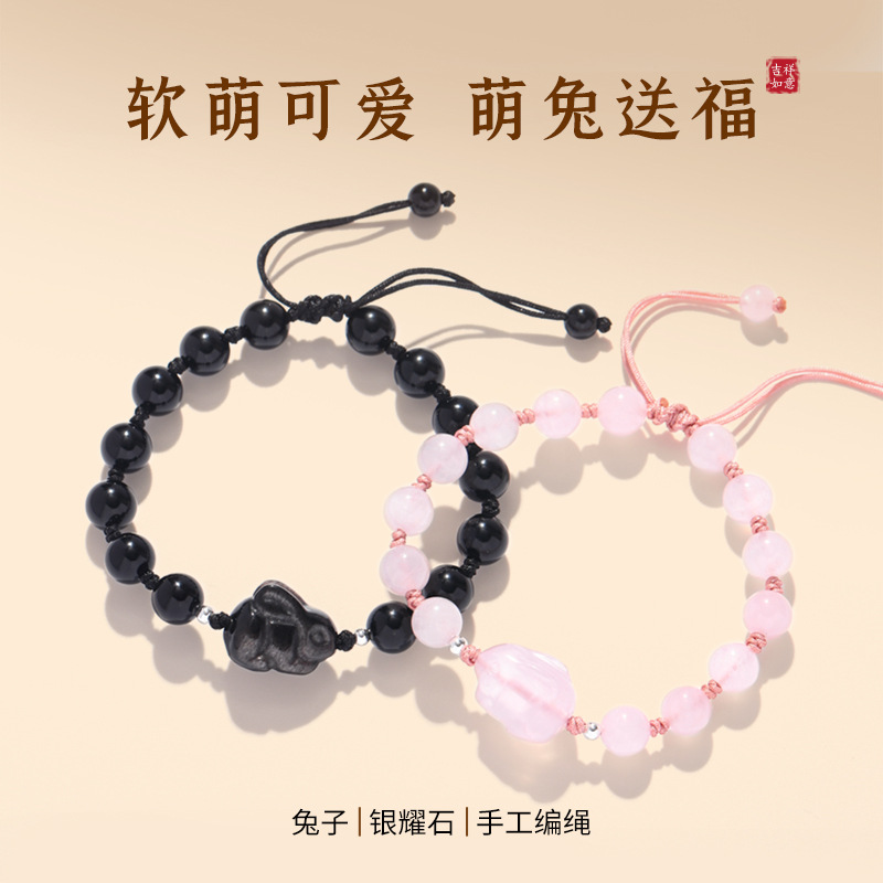 天然粉晶兔子手工编织手链女黑曜石手串本命年学生闺蜜情侣礼物