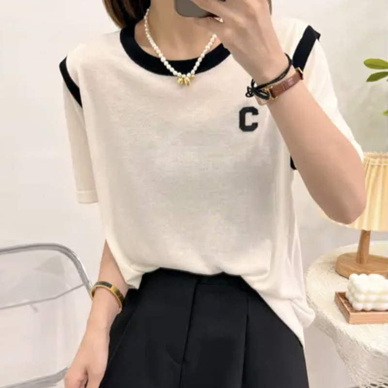 短袖正肩T恤女夏季宽松百搭冰丝针织衫撞色刺绣设计感小众上衣服