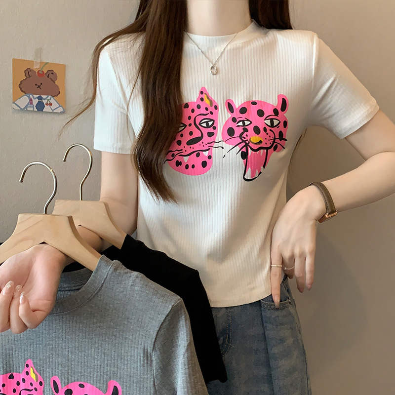 正肩t恤女短袖ins潮夏装chic港味老虎印花垫肩设计感辣妹短款上衣