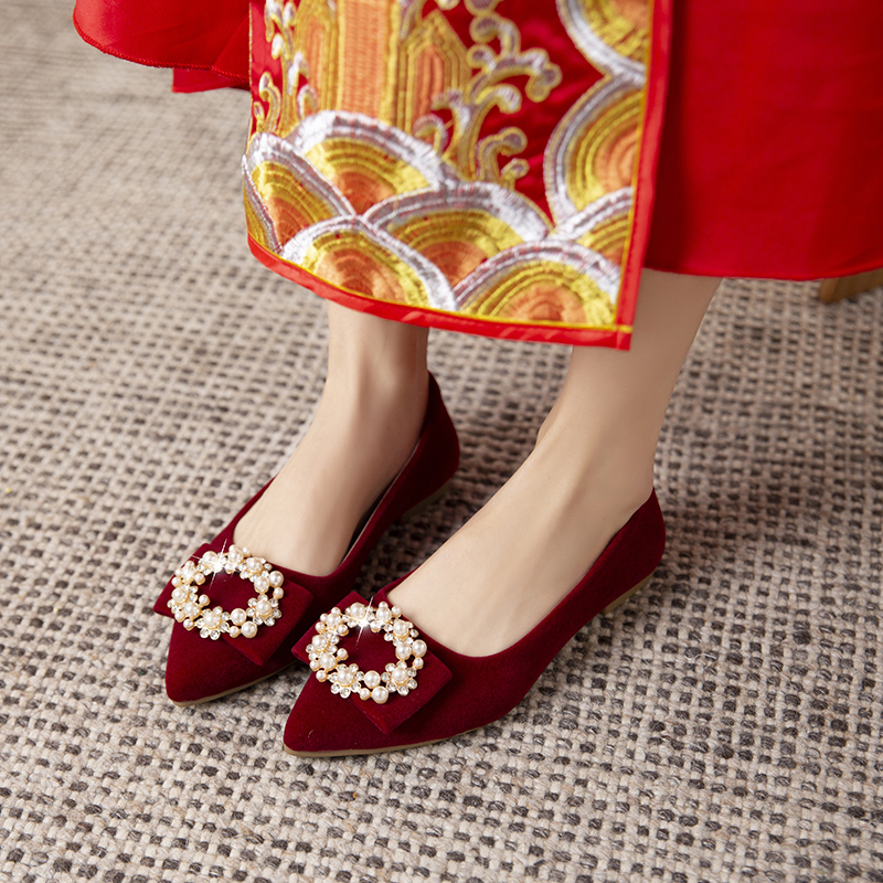 红色婚鞋女2025年新款新娘鞋秀禾婚纱两穿平底鞋珍珠软底孕妇单鞋