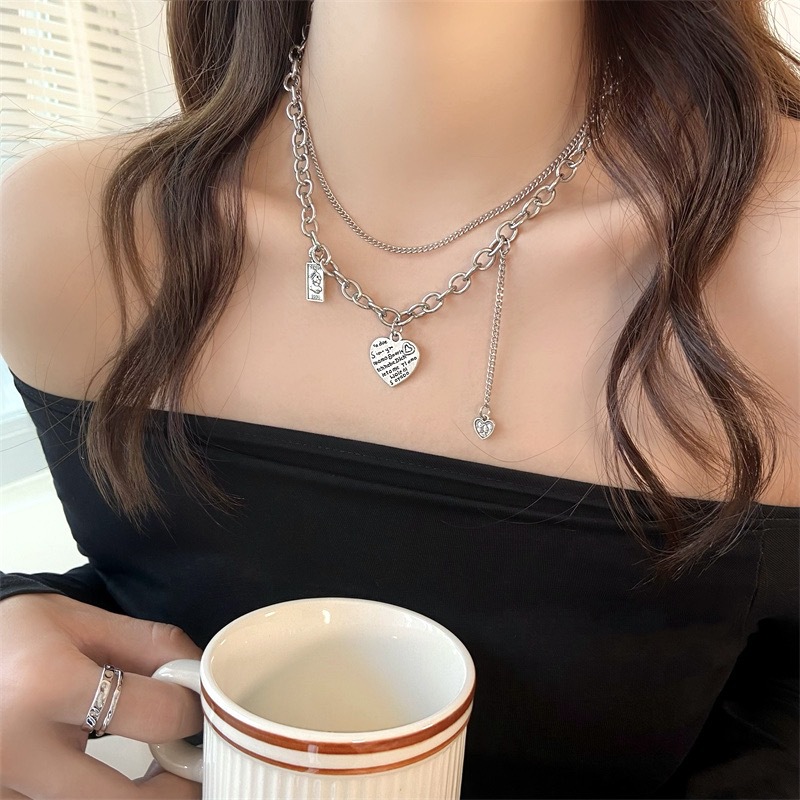 欧美复古双层立体爱心字母项链女时尚嘻哈复古流苏方牌人像锁骨链
