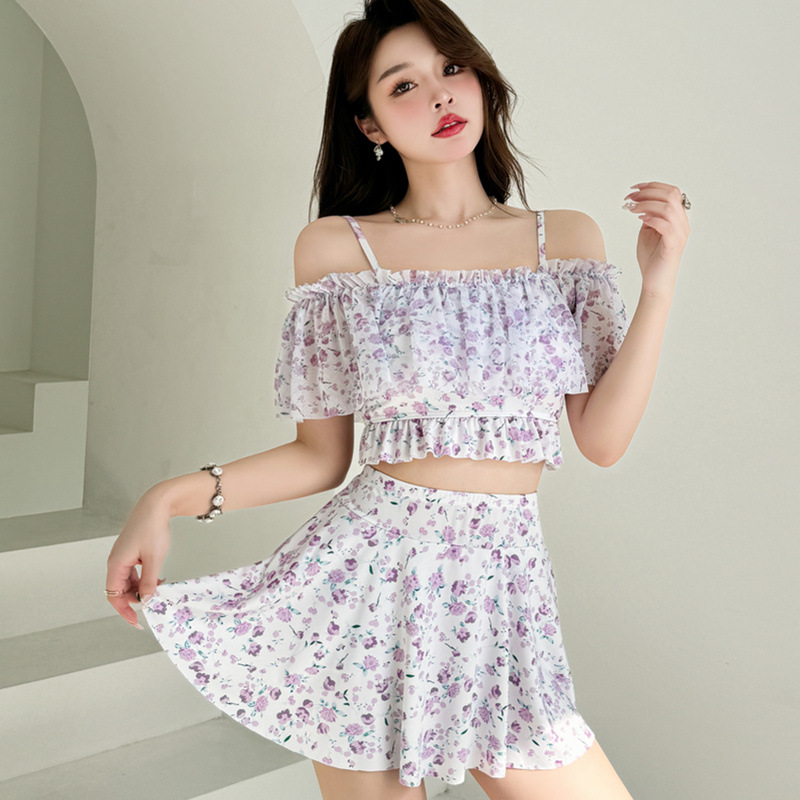 游泳衣女仙气连体荷叶边保守显瘦遮肚温泉少女甜美小清新学生泳装