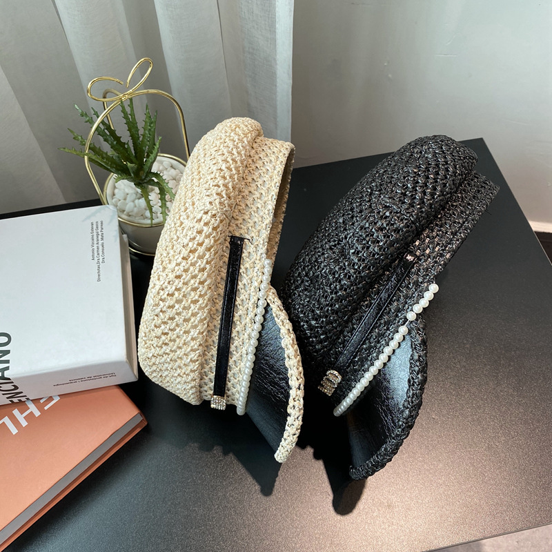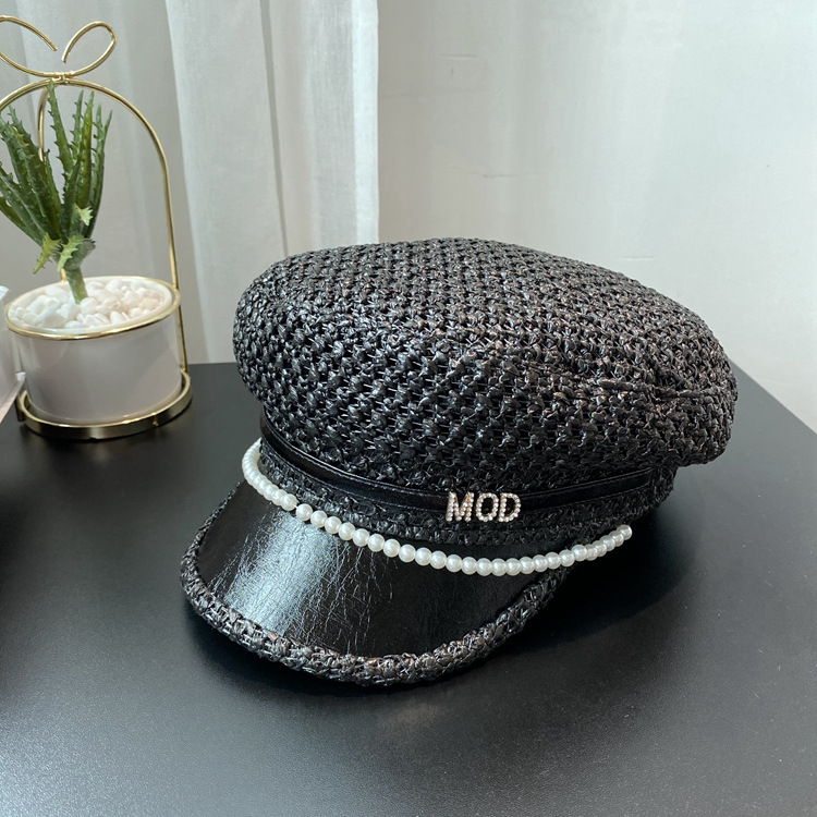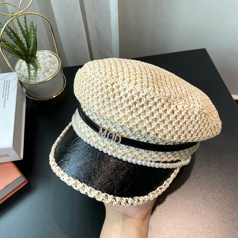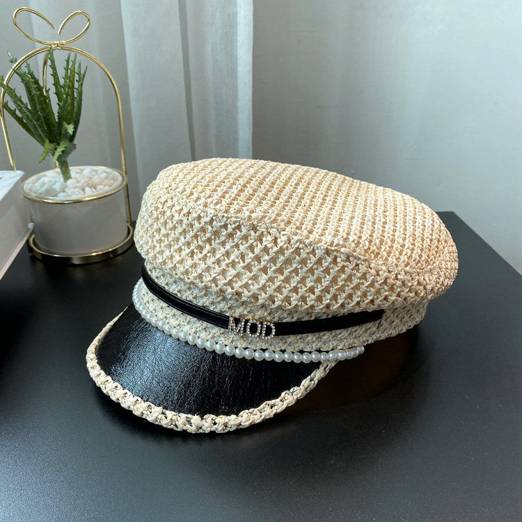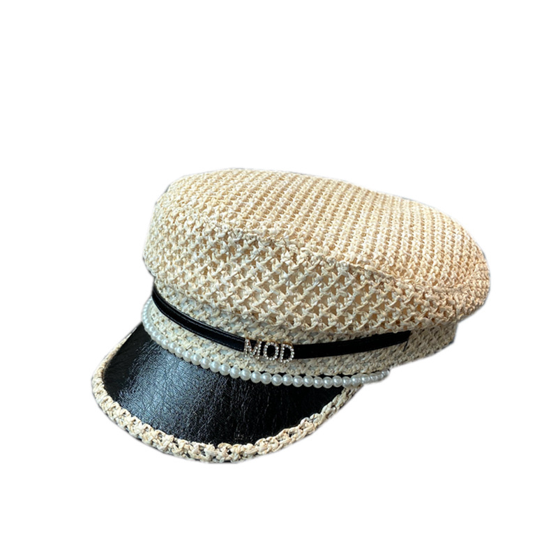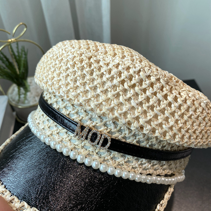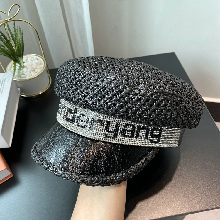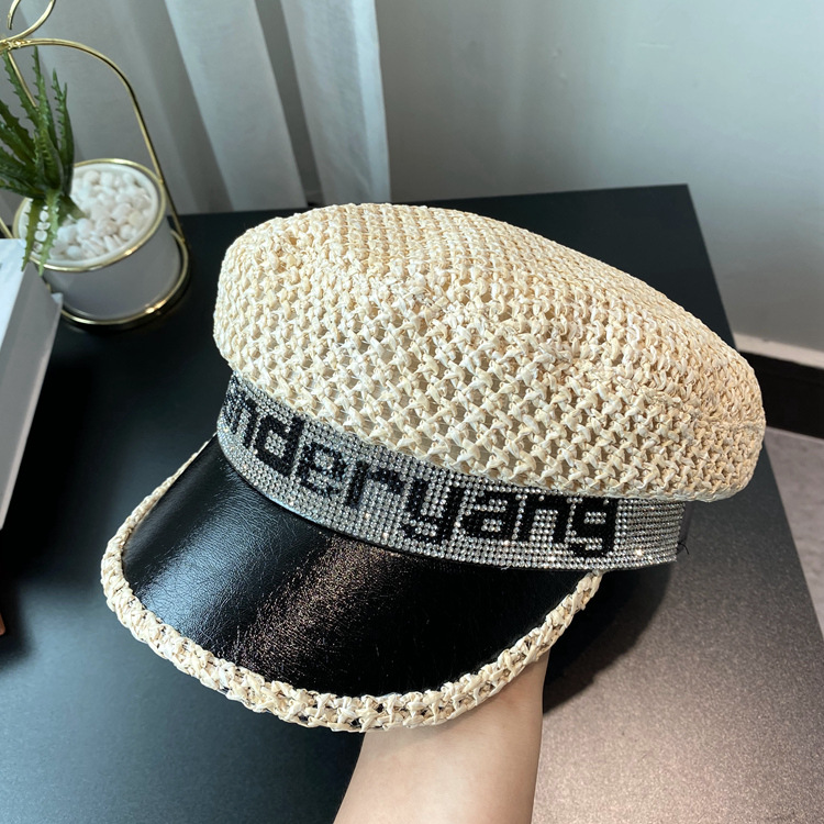 韩版网红名媛风草编平顶海军帽子女春夏英伦水钻皮檐贝雷帽报童帽