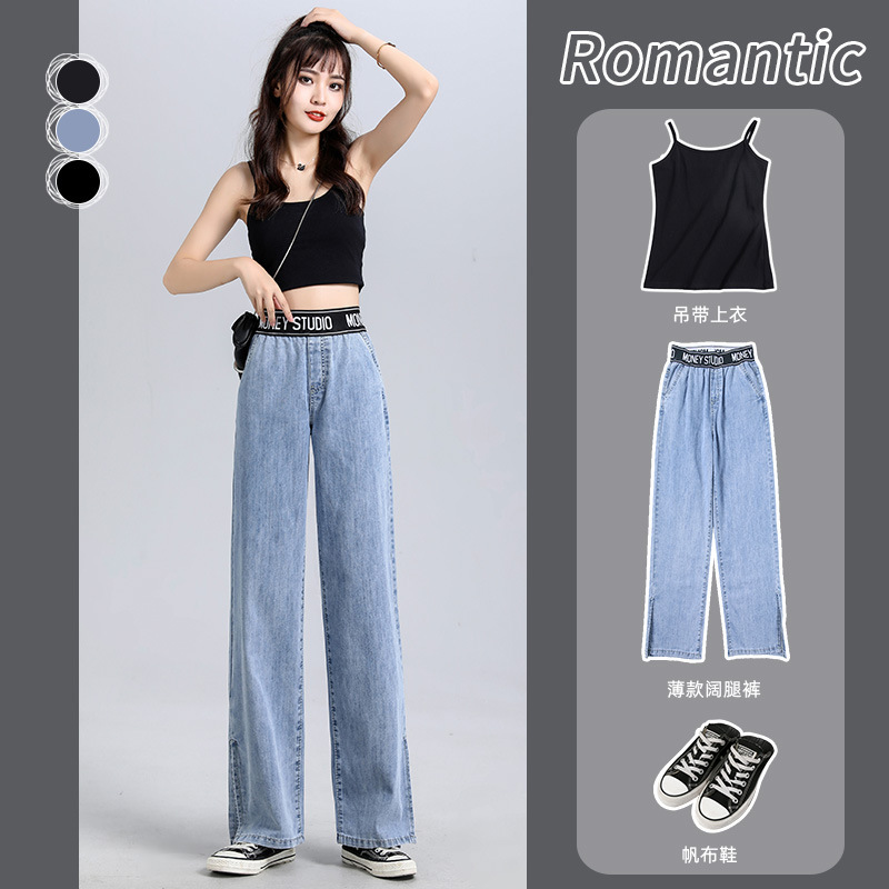 高档天丝薄款高腰牛仔裤韩国女装垂感阔腿宽松直筒显瘦百搭拖地裤
