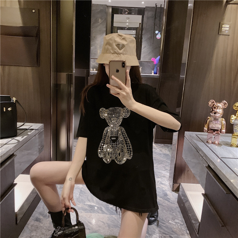 欧洲站潮牌高级感黑色短袖T恤女重工烫钻小熊精梳棉宽松体恤