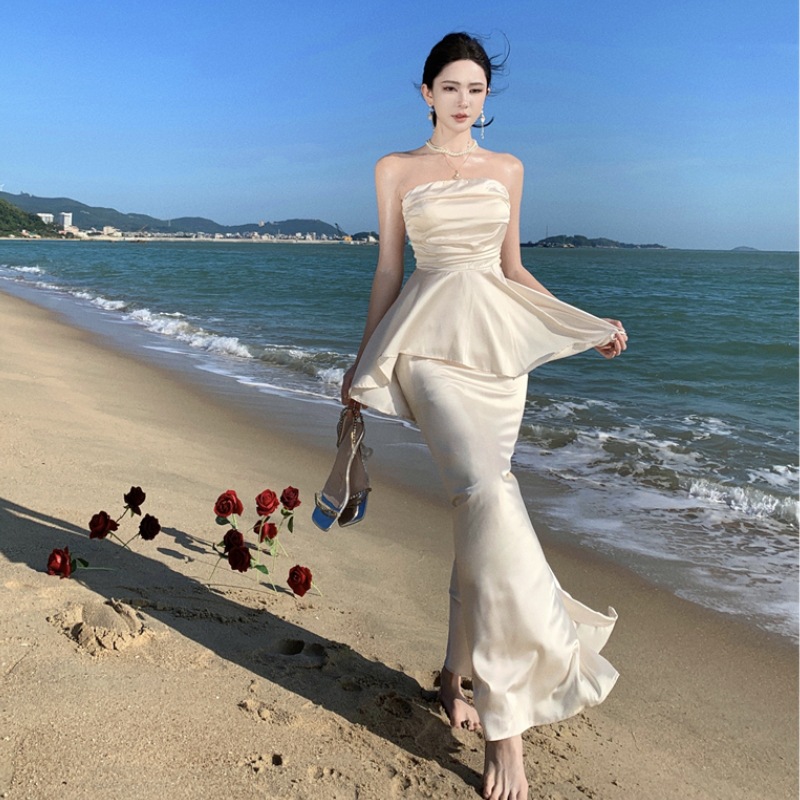 酒店宴会纯欲高开叉连衣裙夜场气质一字肩抹胸连衣裙包臀晚礼服裙