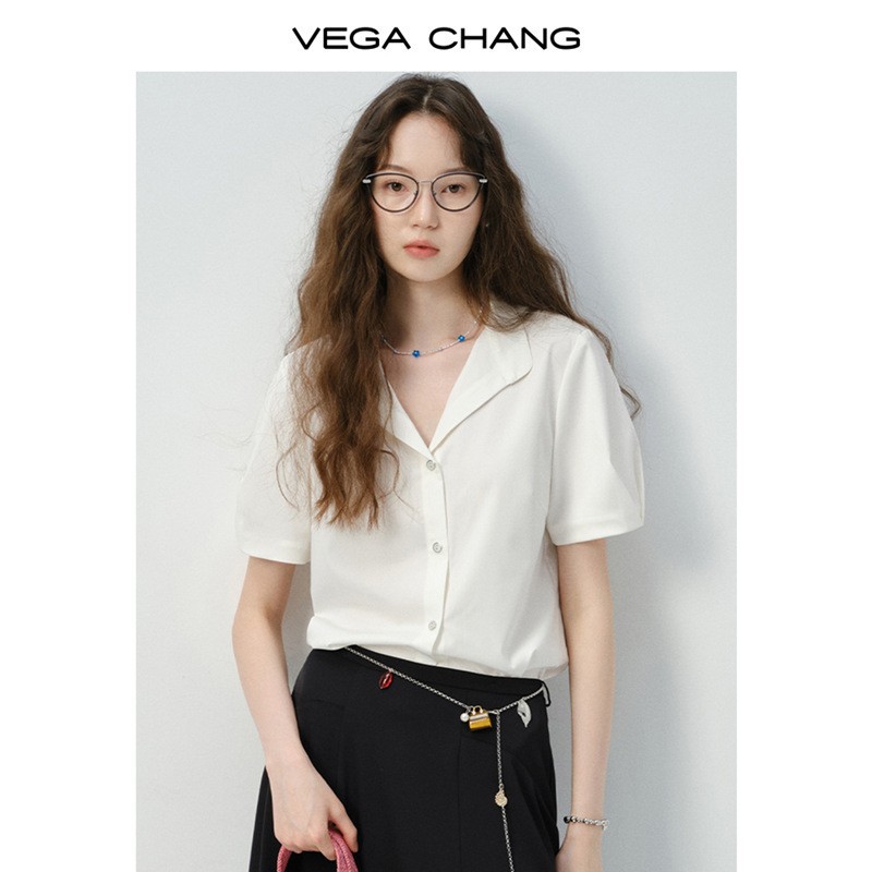 VEGA CHANG短袖衬衫女2025新款夏通勤百搭翻V领设计简约休闲衬衣