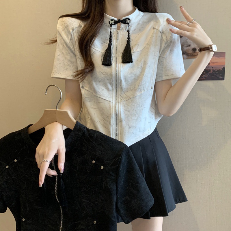 实拍新款胖MM新中式国苏双拉链上衣修身显瘦洋气小衫