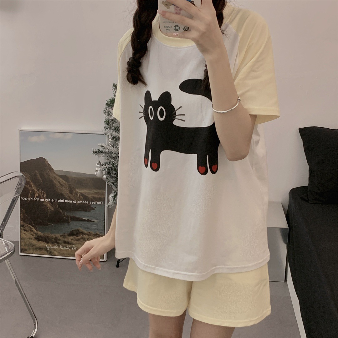 奶油黑猫家居服夏季短袖短裤可爱睡衣治愈休闲浪漫可外穿柔软纯棉