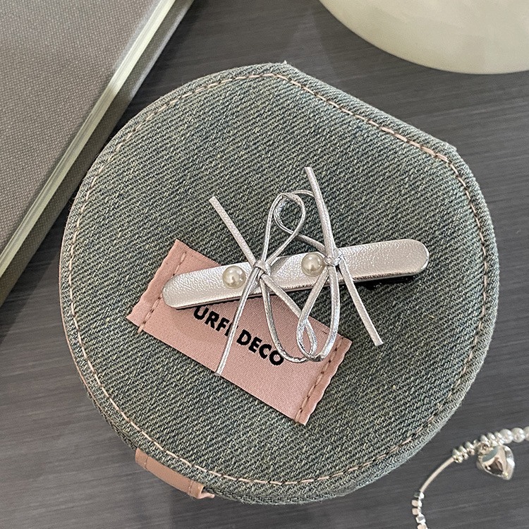 银色皮质珍珠蝴蝶结发夹边夹芭蕾风侧边刘海夹发卡前额碎发BB夹