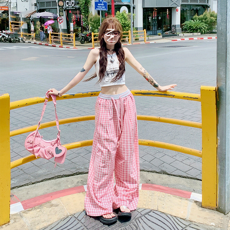 粉色格子阔腿裤女夏季薄款新款高腰垂感直筒休闲裤宽松山本裤