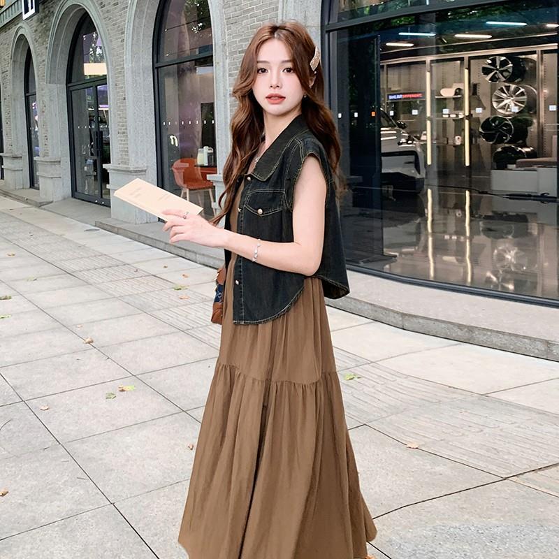 欧洲站夏季新款潮流时尚马甲背心上衣轻熟风大摆长裙两件套