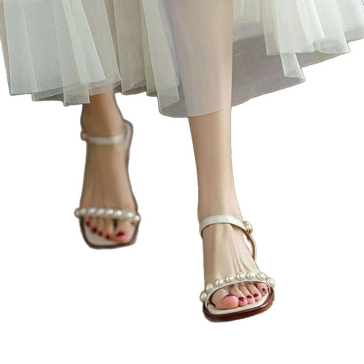 2025年夏季新款珍珠一字带凉鞋女时尚舒适低跟露趾平底沙滩鞋外穿