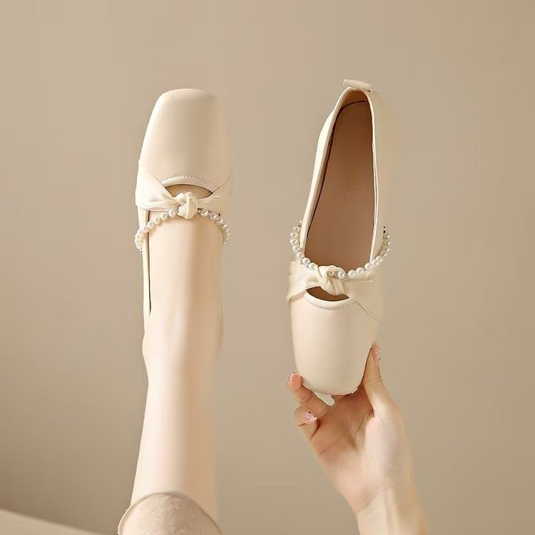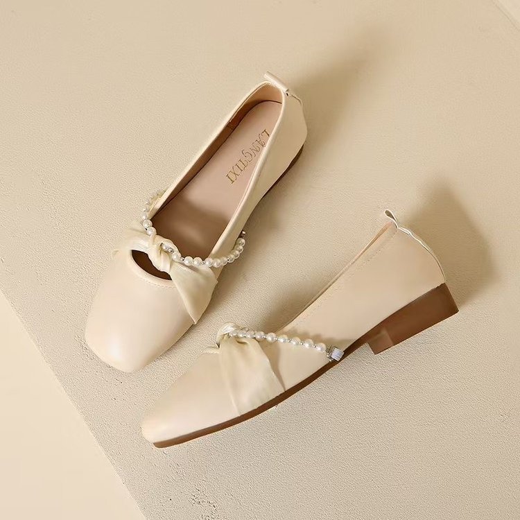 法式温柔风单鞋女春平底2025新款珍珠瓢鞋软底豆豆鞋方头浅口女鞋