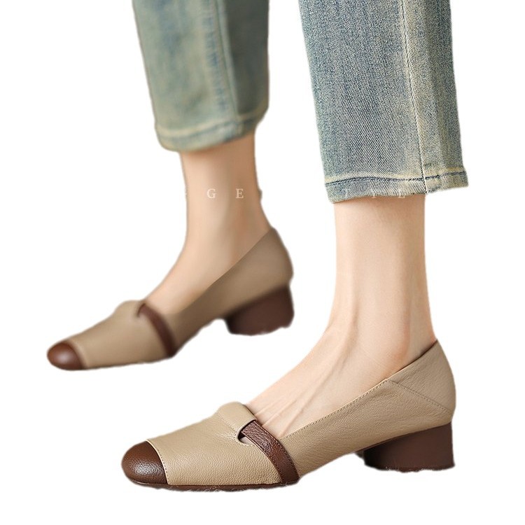 春季软底法式女鞋浅口复古新款单鞋一脚蹬拼色圆头低跟工作小皮鞋
