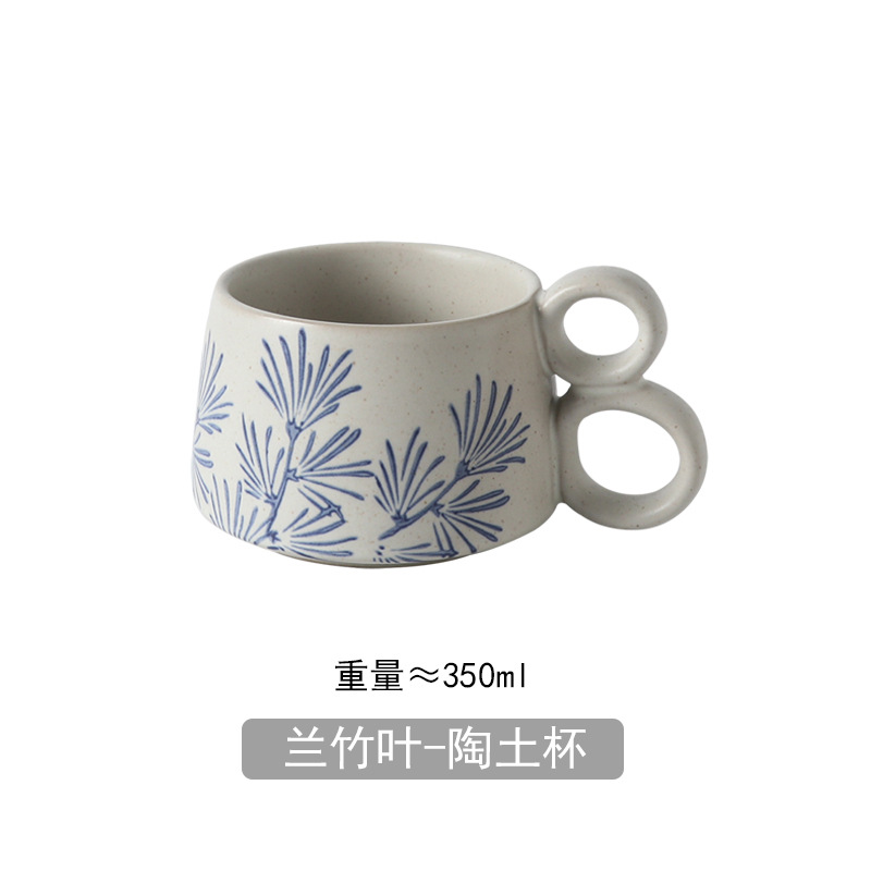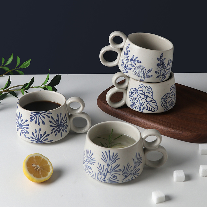 手绘青花釉马克杯复古粗陶创意家用水杯釉下彩咖啡早餐杯情侣礼物