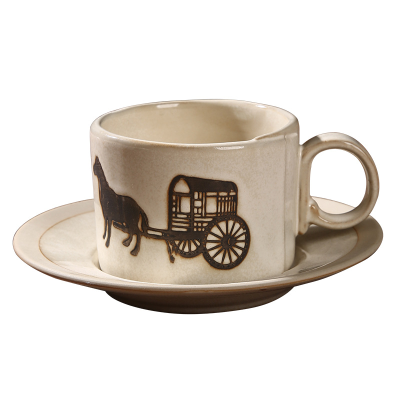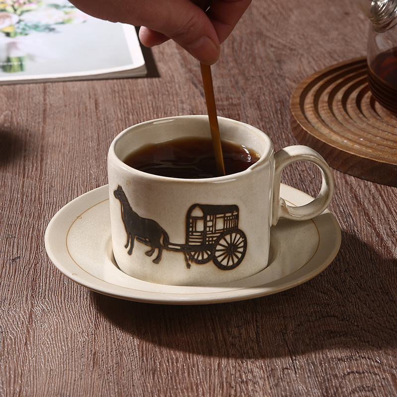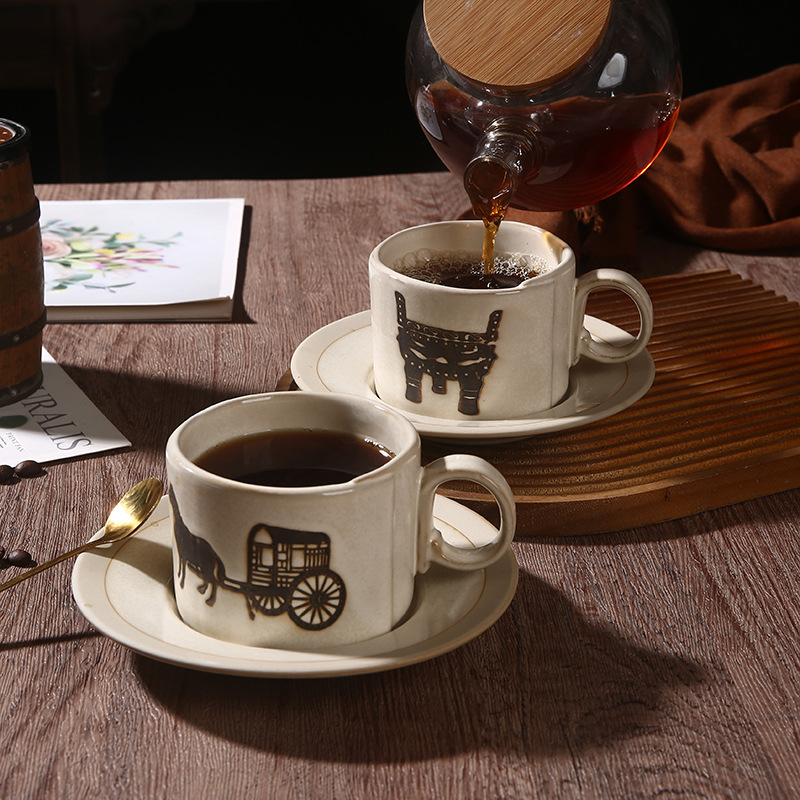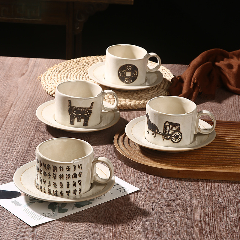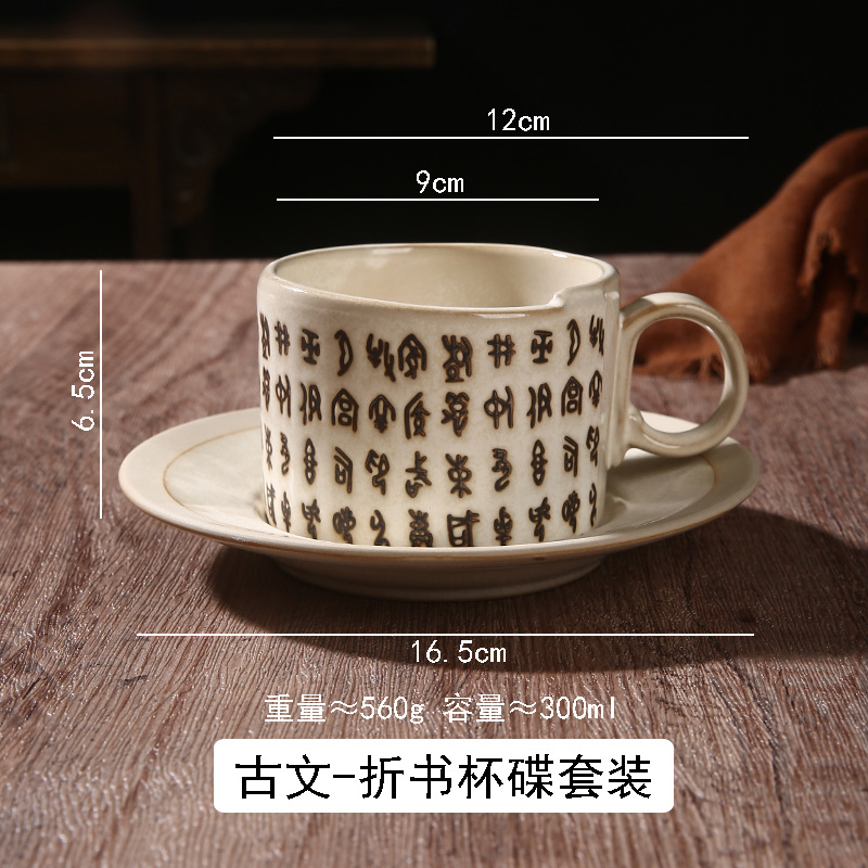 古典咖啡杯碟办公室家用拉花杯复古马克杯创意文字浮雕牛奶咖啡杯