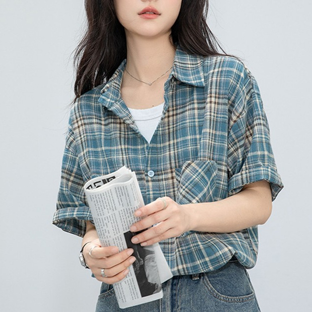 气质绝佳~格子衬衫宽松Polo领通勒短袖上衣衬衫女夏季新款