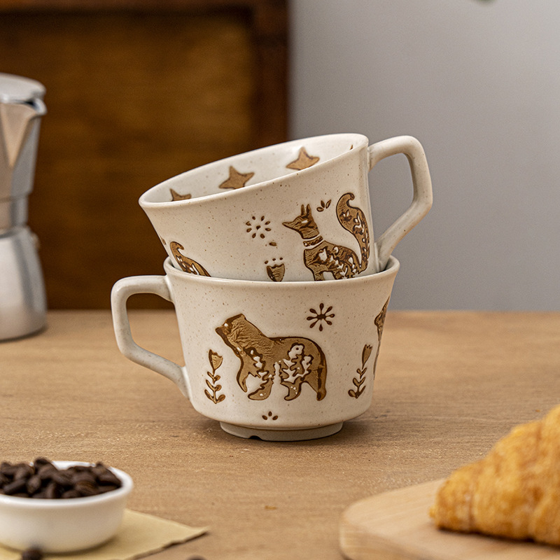 粗陶咖啡杯复古法式浮雕马克杯高颜值家用陶瓷杯子新款早餐牛奶杯