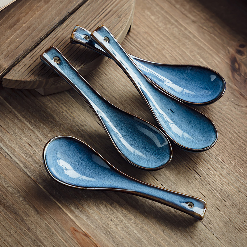 日式和风蓝色陶瓷勺子复古餐勺创意喝汤勺家用调羹小汤勺