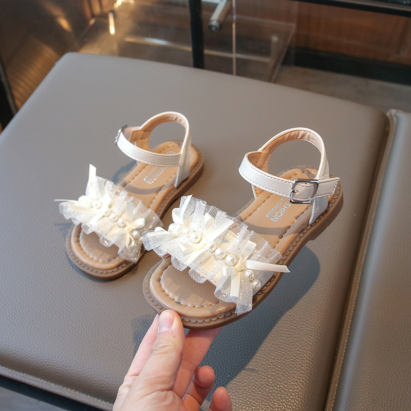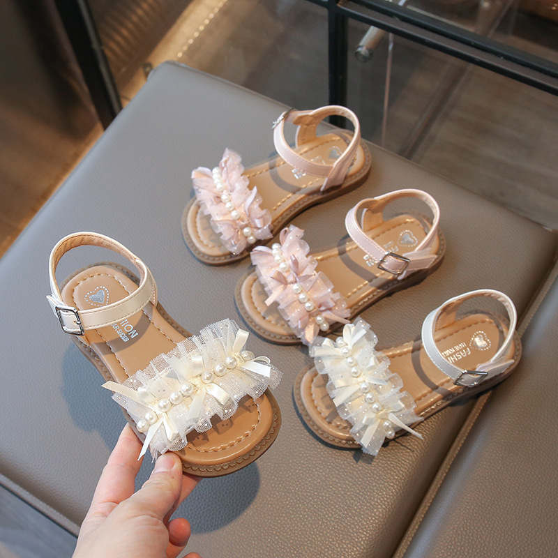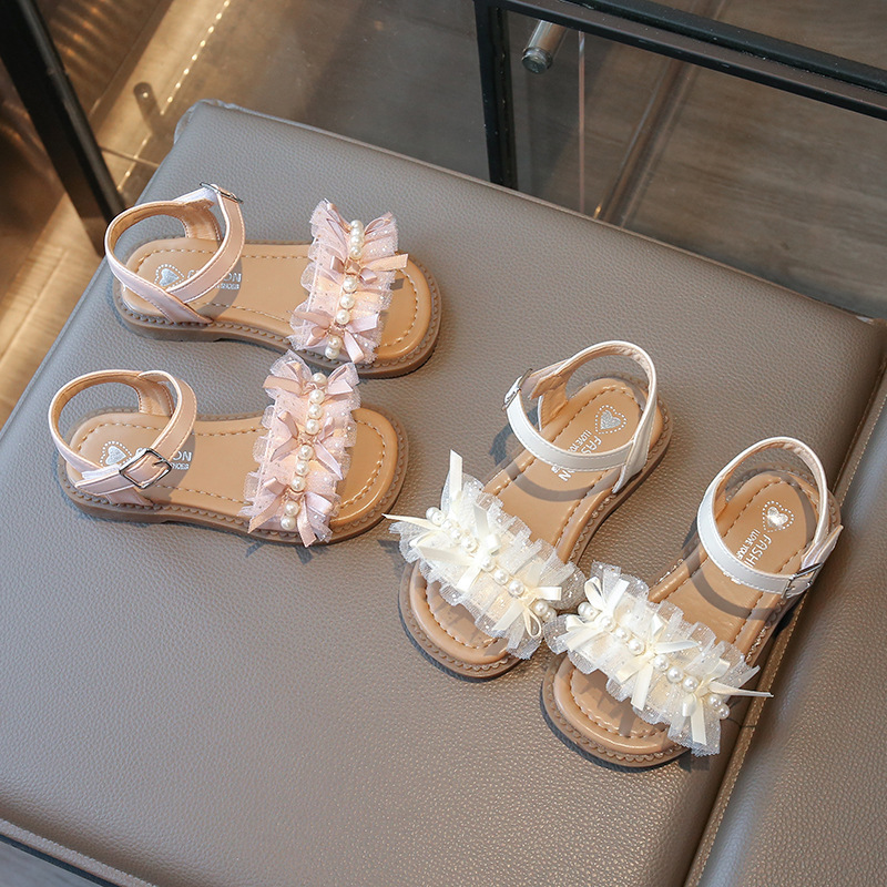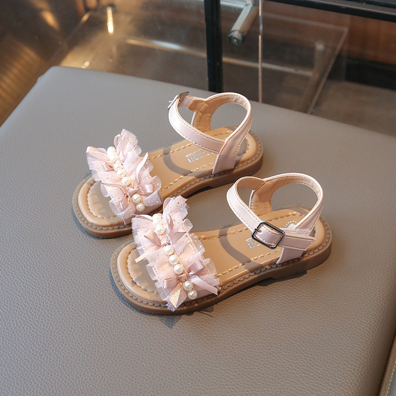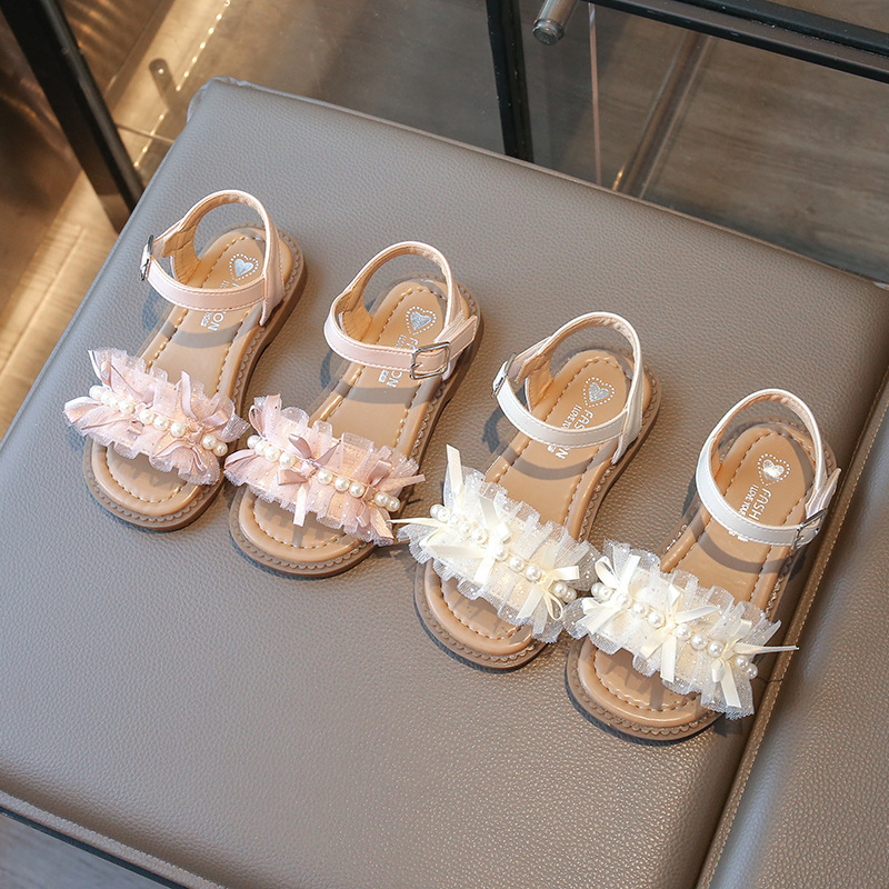 童鞋2025夏天凉鞋儿童珍珠蕾丝女童漂亮公主鞋软底露趾防滑沙滩鞋