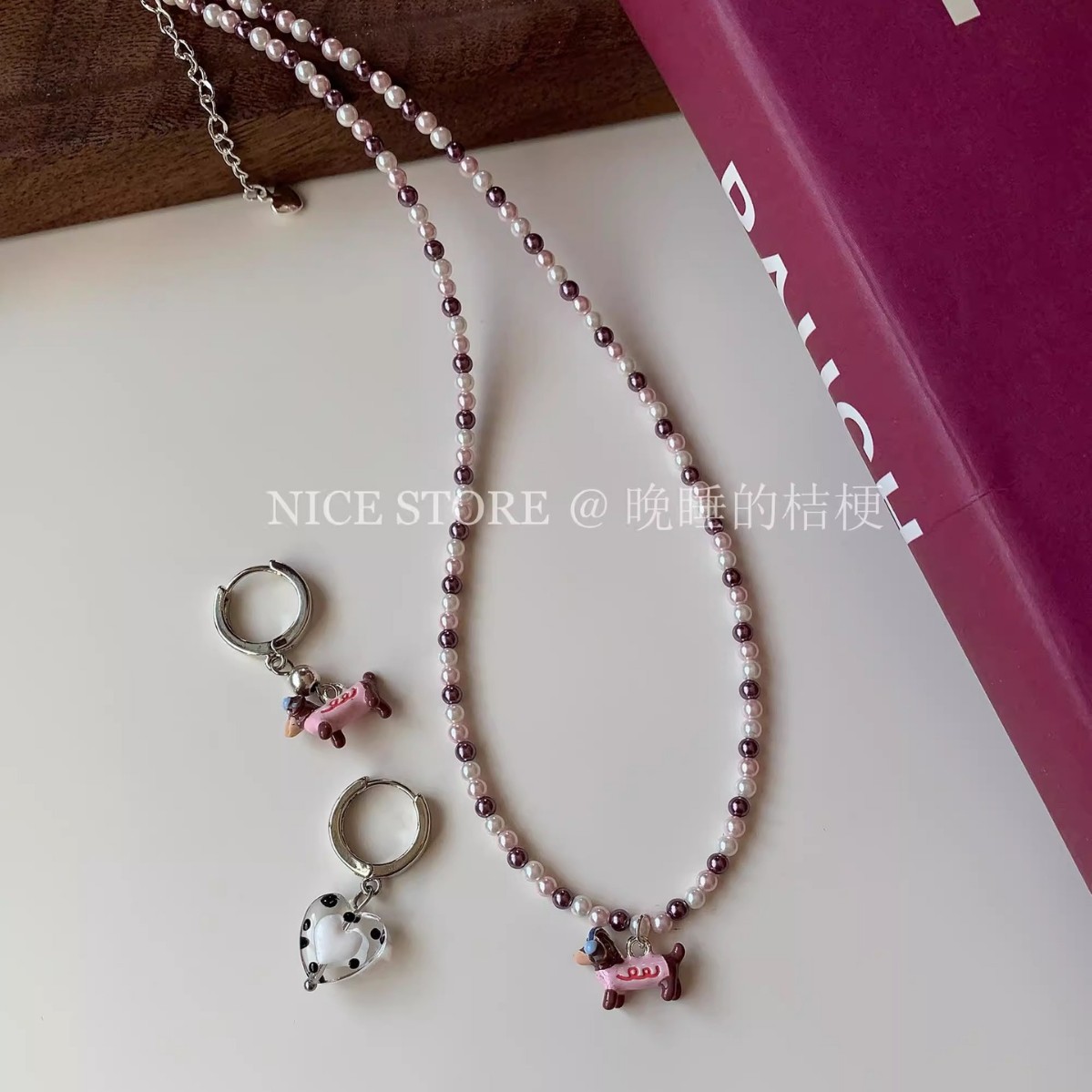 「可爱加倍」粉色腊肠小狗珍珠项链爱心少女感百搭耳环