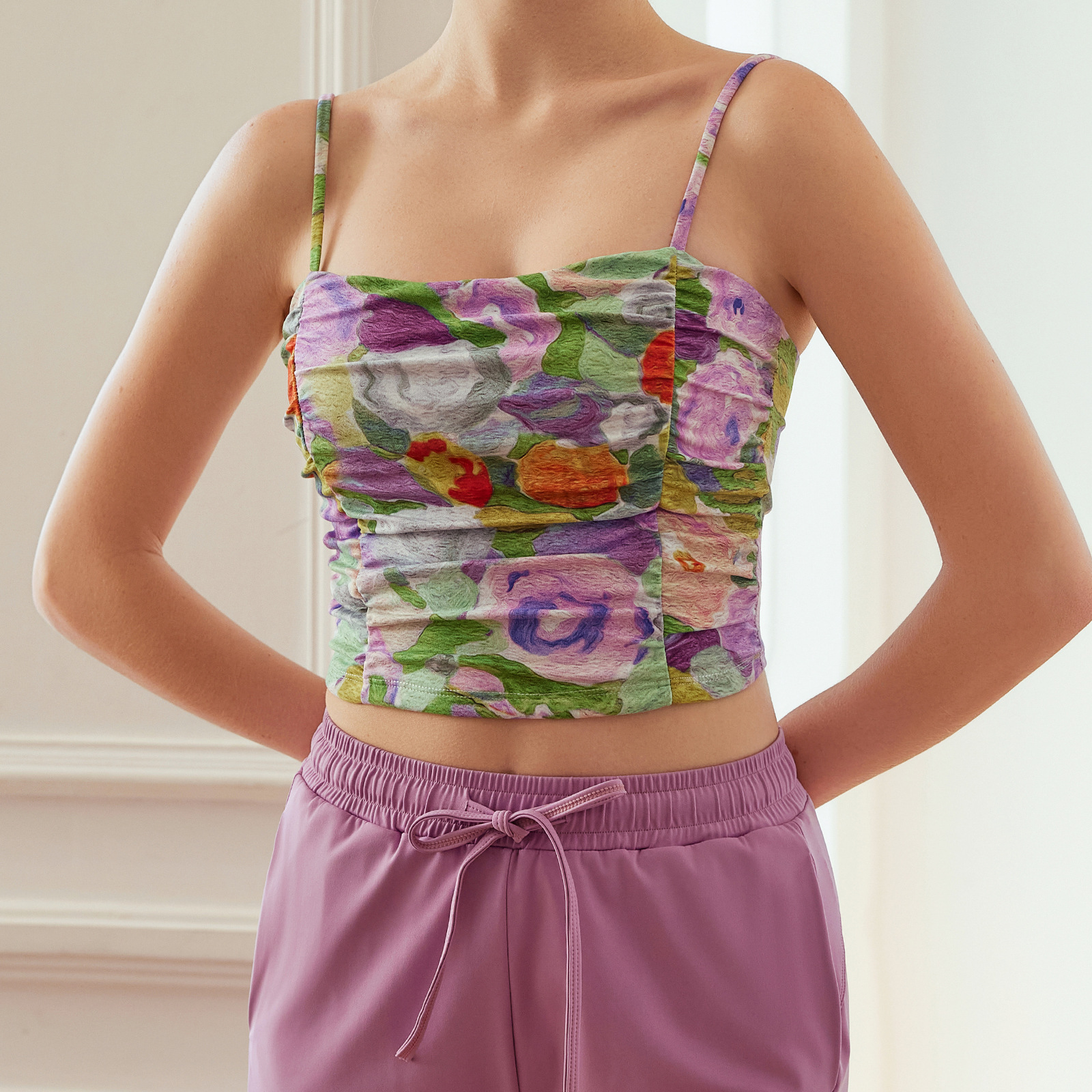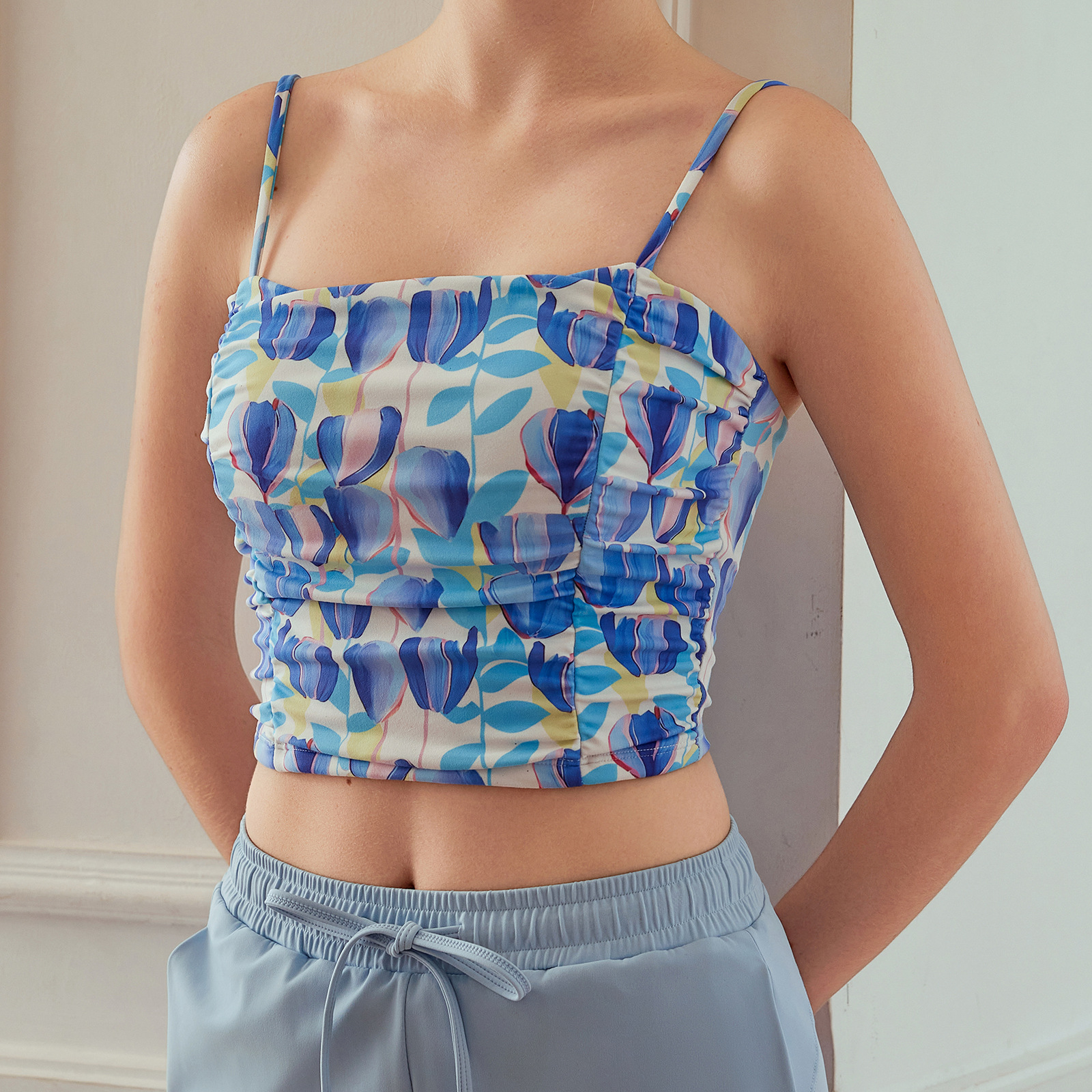 蕾丝拼接V领系带小吊带女辣妹修身分割坑条短上衣